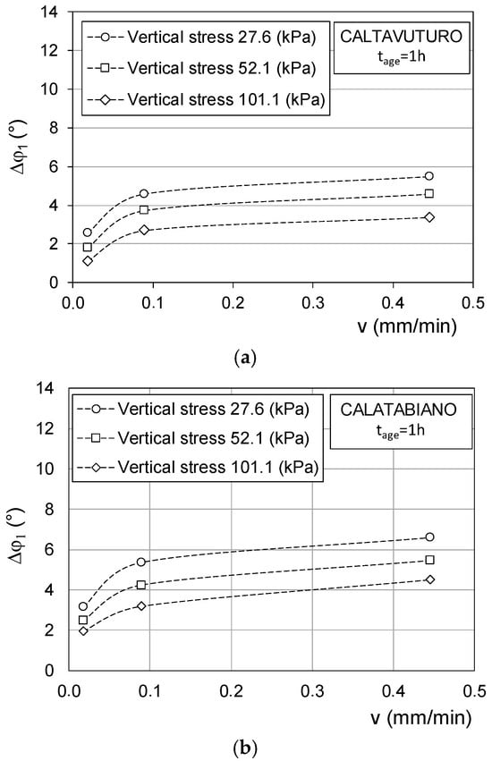 The increments of ∆φ1 after one hour of ageing and with varying vertical stresses and reactivation shearing speeds are reported in Figure 7 for both Caltavuturo (Figure 7a) and Calatabiano clays (Figure 7b). It is possible to notice how the reactivated strength grows in direct proportion to the shearing speed, whereas the relationship with the vertical stress is of inverse proportionality; this follows from the fact that the reactivated strength envelope slightly shifts upwards, with the result that ∆φ1 increases more as the vertical stress decreases.