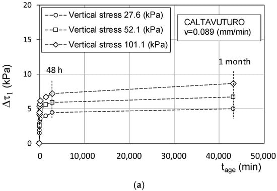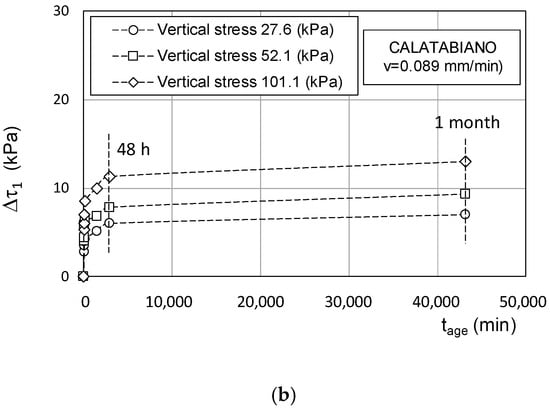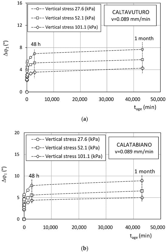 Figure 9 shows, for both Caltavuturo (Figure 9a) and Calatabiano clays (Figure 9b), the increase in strength, ∆τ1, for a reactivation speed of 0.089 mm/min by considering the influence of both the vertical stress and the quiescence time, the latter extended up to one month. The equivalent representation in terms of secant strength angle, ∆φ1, is shown in Figure 10 for both Caltavuturo (Figure 10a) and Calatabiano clays (Figure 10b).