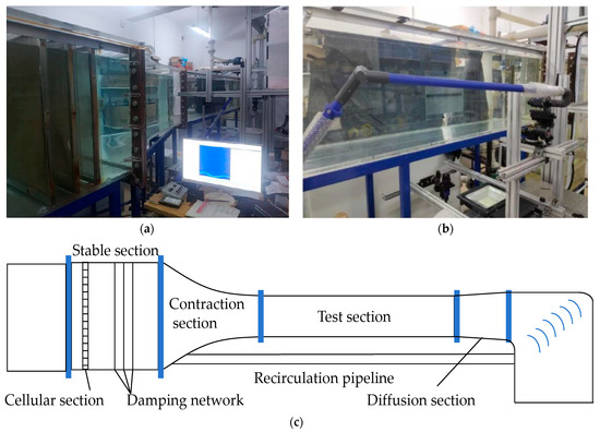 Schematic diagram of experimental apparatus: (a) medium-sized low-speed circulating water tank physical diagram; (b) physical image of the experimental smooth plate; (c) medium-sized low-speed circulating water tank physical schematic diagram.