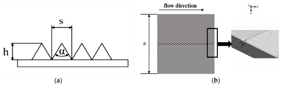 Schematic diagram of riblet plate: (a) the size of riblets; (b) top view of 30° divergent riblets.