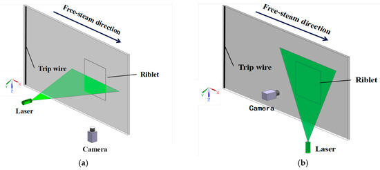 To ensure the existence of a single variable and to maintain the dimensionless size of the riblets within the optimal drag reduction range [23], adjustments were made to the motor during the experiment to achieve an incoming free stream velocity of U∞ = 0.21 m/s. The experimental environment was kept at 20 °C, with the density of the experimental water being 996.7 kg/m3 and the kinematic viscosity of water equaling 1.006 mm2/s. The experimental setup and layout are shown in Figure 3. In the experiment, the flat plate was placed vertically, and by adjusting the trailing edge plate, the static pressure gradient along the flow direction on the plate surface was adjusted to be close to zero. Photographs were taken of the x-y and x-z planes under each wall surface. The working surface was 260 mm away from the side wall of the test section, and after measurement, the influence of the water channel side wall boundary layer on the flow in the measurement plane could be neglected. The x-y shooting plane is located at the center of the symmetrical plane in the model, that is, directly above the convergence and divergence junction of the convergent and divergent riblet wall surfaces. The x-z shooting plane is parallel to the smooth flat plate. The x/y/z directions in the figure represent the streamwise direction, normal direction, and spanwise direction, respectively, with the corresponding velocities represented by u, v, and w. For the x-y shooting plane, the origin of the smooth flat plate’s streamwise coordinate is located 150 mm from the front edge of the recess, and the normal coordinate is at the smooth wall surface. The streamwise coordinate position of the riblet wall surface origin remains unchanged, and the normal coordinate is the coordinate after the zero point is offset. According to the calculation [23], the protrusion height of the riblet hp = 0.17 s, which means the zero point’s coordinate is 0.204 mm below the tip of the riblet. For the x-z plane, the origin’s streamwise coordinate is also located 150 mm from the front edge of the recess, and the spanwise coordinate is located at the midpoint in the spanwise direction of the model.