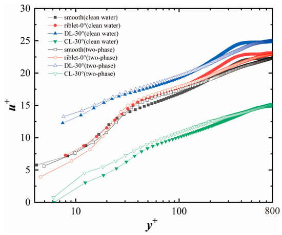 Table 1 presents the flow parameters for each wall surface in both flow fields, with the inner scale Reynolds number defined as Reτ = uτδ/ν, where δ is the nominal boundary layer thickness. Combined with the wall friction shear stress τw = and the average free stream velocity U∞, the wall friction coefficient can be obtained as Cf = 2τw/ρ, and the drag reduction rate is given by DR = (Cfs − CfR)/Cfs × 100%, where Cfs and CfR are the friction coefficients for the smooth and riblet walls, respectively. The data in the table clearly reflect the changes in the velocity profiles of each wall surface shown in Figure 4, where a positive F value indicates an upward shift in the velocity profile and a reduction in drag, and vice versa. The 30° divergent riblet wall achieved a drag reduction rate of 21.70% in the clear water flow field, a figure very close to previous research results [28,38]. In the two-phase flow field, the drag reduction rate for this wall surface reached 26.18%, indicating that the addition of particles has a certain degree of enhancement on the drag reduction effect.