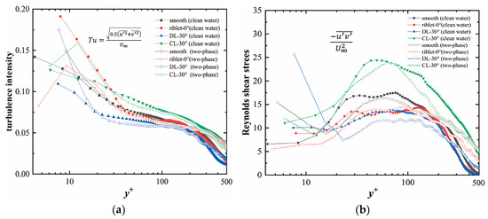 Figure 5 presents the distribution curves of dimensionless comprehensive turbulence intensity and Reynolds shear stress along the wall-normal height in the turbulent boundary layer under different conditions. It can be observed that the streamwise riblet and 30° divergent riblet walls both reduce the comprehensive turbulence intensity within the turbulent boundary layer. The intensity of the streamwise riblet is very close to that of the smooth wall, primarily reducing the turbulence intensity in the logarithmic law region but enhancing it in the buffer layer region. In contrast, the 30° divergent/convergent riblet walls reduce/enhance the overall turbulence intensity of the boundary layer. According to the research by Cui et al. [46], this is because the upwelling motion of the fluid in the boundary layer of the convergent riblet wall brings the fluid with larger near-wall turbulence fluctuations away from the wall, resulting in a higher turbulence intensity within the boundary layer at the same height for the convergent riblet wall. Conversely, the downward motion on the divergent riblet surface plays exactly the opposite role. The streamwise riblet surface lacks the presence of secondary flows, leading to a weaker suppression of turbulence fluctuations, resulting in slightly different changes in turbulence intensity in the buffer layer and logarithmic law region. In Figure 5b, the distribution curve of Reynolds shear stress is similar to that of the comprehensive turbulence intensity. Among the configurations, the 30° convergent riblet surface exhibits significantly higher Reynolds shear stress compared to both the smooth wall and the 30° divergent riblet surface. All of these changes are consistent with the characteristics of drag-reduction surfaces. From both figures, it can be observed that the addition of particles leads to a decrease in the comprehensive turbulence intensity and Reynolds shear stress in the logarithmic law region, while the intensity in the buffer layer and wake region is enhanced. This is because, for the buffer layer closer to the wall, the transpiration motion caused by particle–wall collisions and the vortices generated by the particles themselves lead to an enhancement of Reynolds shear stress and turbulence intensity [47]. The increase in boundary layer thickness leads to a slower decrease in the intensity of the wake region, resulting in some regions having higher intensity than in the clear water flow field.
