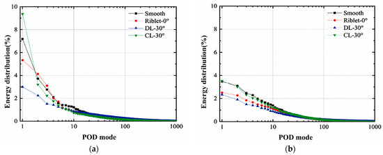 To better observe the streak structures in the turbulent boundary layers of different wall surfaces, the Proper Orthogonal Decomposition (POD) method was utilized to extract the highest energy-containing low-order modes for each condition and compare them. The Proper Orthogonal Decomposition, introduced by Lumley [49], is a mathematical technique that can extract coherent structures from flow fields. The principle involves decomposing the original data into multiple spatial modes (called eigenmodes) and the corresponding time evolution coefficients (sequences) for each mode, which are mutually orthogonal. The order of the modes is sorted according to the energy they capture, from high to low, with the energy being given by the eigenvalues corresponding to the eigenmodes. The expansion in these eigenmodes optimally captures the energy of the data. Modal decomposition techniques provide a powerful means of identifying an effective low-dimensional coordinate system for capturing the dominant flow mechanisms, with the reduction in system order corresponding to the selection of an appropriate (reduced basis) coordinate system to represent fluid flow [50].