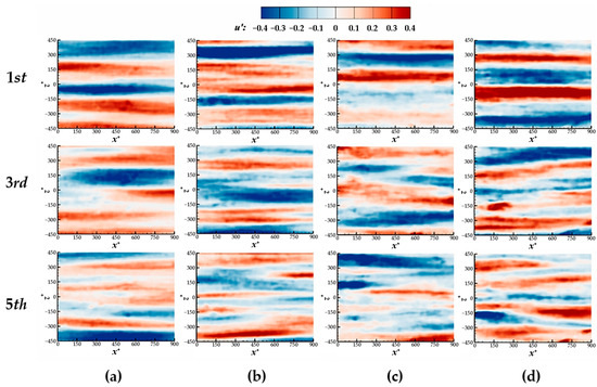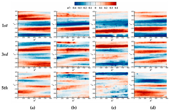POD mode cloud image of different wall streamwise fluctuation velocity at y+ = 8.8 in clear water flow field for the first five orders: (a) smooth flat wall; (b) streamwise riblet wall; (c) 30° divergent riblet wall; (d) 30° convergent riblet wall.