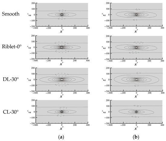 To reduce the interference of small-scale structures in the flow field, low-order modes containing 50% of the energy were selected to reconstruct the flow field, followed by the calculation of the correlation function of the flow field. Figure 9 shows the two-point correlation coefficient graph of the streamwise fluctuating velocity; in this graph, the characteristic spanwise scale can be defined as the gap between two negative valleys, that is, the distance between the two lines in the figure. It can be seen from the graph that the two-point correlation coefficient can fully display the structural morphology of the flow field, which is distributed in a strip-like pattern and stretched along the streamwise direction. By comparing the results longitudinally, it can be observed that the two-point correlation coefficients for different walls in the two flow fields all show the same trend of change. From the smooth flat to the 30° divergent riblet walls, the distribution of the correlation coefficient Ru′u′ continuously expands in the spanwise direction and is also elongated in the streamwise direction, representing an increase in the range of low-speed fluids. This trend is consistent with the previously mentioned trend in the streak spacing increasing with the wall-normal height y+, indicating that the motion of the streaks in the spanwise direction is suppressed. In contrast, the distribution graph of the 30° convergent riblet shows a completely opposite change, indicating that it promotes the motion of the streaks and enhances the spanwise mixing of turbulent structures in the near-wall region. By comparing the left and right sides of Figure 9, it can be seen that the addition of particles can effectively suppress the motion of the streak structures and enhance the stability of the flow field. The degree of mixing of high- and low-speed fluids is reduced, which means fewer vortex structures appear and the transfer of momentum and kinetic energy is decreased.