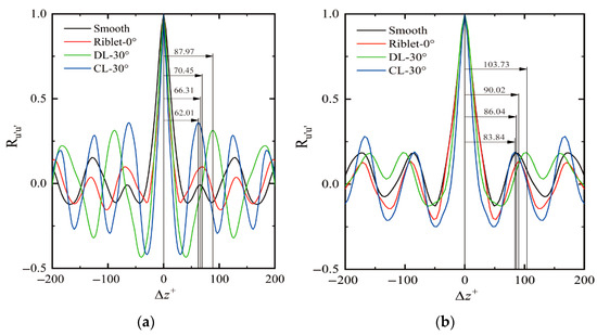 To more intuitively compare the spanwise spacing of streaks under each type of wall, further processing of the correlation function of streamwise fluctuating velocity in space is carried out. By performing an autocorrelation operation on u′ only in the spanwise direction, the distribution of Ru′u′ along Δz+ can be obtained, and its expression is:
