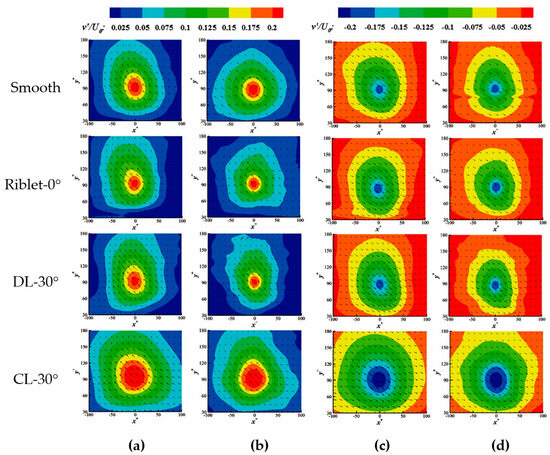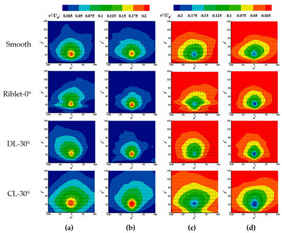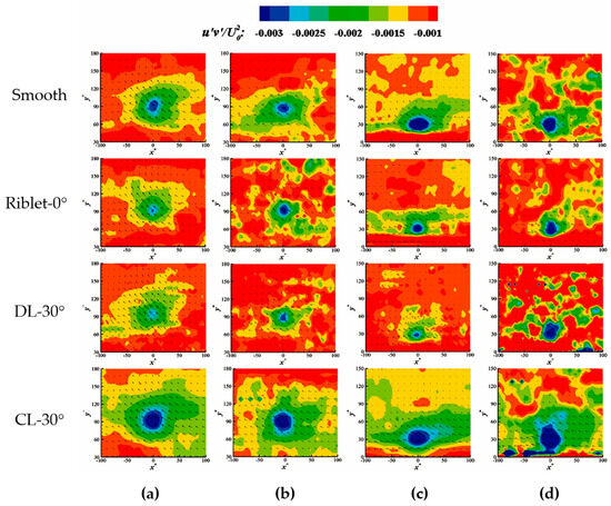Due to the close relationship between burst events and Reynolds shear stress and the near-wall self-sustaining mechanism, to extract a clearer topological structure for comparison, this section synthesizes the Reynolds stress distribution curves under various conditions and selects the extraction plane as being near the extreme value of comprehensive Reynolds stress at y+ = 90 and the region where the self-sustaining mechanism as occurring at y+ = 30.5. First, Figure 11 shows normal fluctuating velocity cloud maps of ejection and sweep events under the four types of walls at a height of y+ = 90. The first two groups of images clearly show ejection events where low-speed fluid moves away from the wall, while the latter two groups depict sweep behavior where high-speed fluid rushes towards the wall. In Figure 11a,c, it can be observed that compared to the smooth wall, the drag-reduction riblet walls do not significantly suppress the burst events, while the 30° convergent riblet walls show a significant increase in the intensity of burst events. This implies that the drag-increasing riblet walls significantly enhance the intensity and region of burst events in the clean water flow field, thus enhancing the momentum exchange within the boundary layer. Further observation of Figure 11b,d reveals that the addition of particles plays a very significant role; the burst behavior of all four types of walls is suppressed. However, it is slightly different from the clean water flow field, under the two-phase flow field, the suppression of burst events by the drag-reduction riblet walls is significantly enhanced. Therefore, the addition of particles strengthens the inhibitory effect of the drag-reduction riblet walls. The suppression of burst events is beneficial to the reduction in momentum exchange, thereby having a favorable impact on drag reduction.