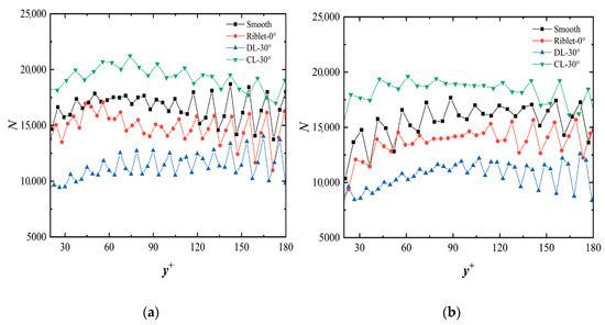 Previous studies have shown that, in the buffer zone, ejection events contribute to 70% of the Reynolds shear stress, and even in the logarithmic region, under a zero pressure gradient, the contribution of ejection events to Reynolds shear stress is higher than that of sweep events [8]. After the addition of particles, the number of sweep events does not change significantly; on the contrary, the number of ejection events varies greatly. Therefore, it can be inferred that in the buffer layer and logarithmic law region where the self-sustaining process occurs, changes in ejection events are an important factor affecting frictional resistance. Figure 13 shows the distribution pattern of ejection events at two normal heights for each wall. Unlike the distribution pattern of streamwise vortex quantities, the number of ejection events does not show a clear decrease with the increase in normal height, but is distributed with small fluctuations around the average value. All four types of walls show a clear stratification phenomenon in both flow fields, with the number of ejection events ranked from small to large as follows: 30° divergent riblets, streamwise riblets, smooth flat plate, and 30° convergent riblets. This also clearly explains that the inhibitory and promotional effects of riblet walls on burst events are not only targeted at their scales, but also significantly reduce and increase their number. Table 2 summarizes the average values of ejection events under eight conditions, confirming not only the existence of the above phenomena but also finding that the addition of particles reduces the frequency of ejection events under all wall surfaces, rather than breaking down burst events into more small-scale structures.