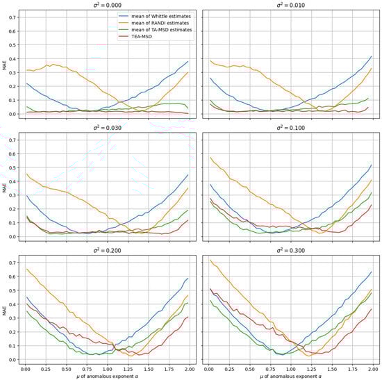 Dependence of MAE(μ) on μ for different values of σ, comparing methods for estimating the anomalous diffusion exponent (through averaging α values for ensemble trajectories and the TEA-MSD method).