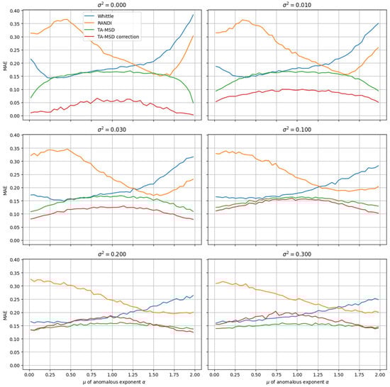 In this subsection, we perform an experimental comparison of the proposed corrected time-averaged MSD method described in Formula (17) and the classical TA-MSD method, the Whittle method, and the α exponent estimation obtained using the RANDI neural network approach.