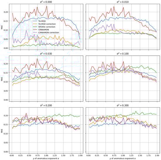 Dependence of MAE of ensemble trajectory α estimates on μ and σ obtained by correction of estimates from different methods. Results for uncorrected TA-MSD and CINNAMON are also shown. Results for the uncorrected Whittle curve have been omitted for clarity and readability.