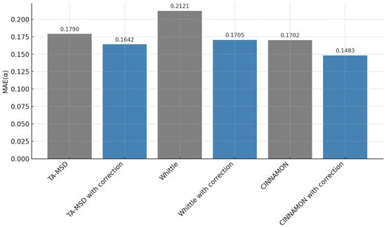 To evaluate the practical utility of our method, we conducted two experiments using the second AnDi benchmark dataset [31]. First, we assessed the benefit of ensemble-based correction in our team’s solution submitted to the second AnDi Challenge. Performance was evaluated using the MAE metric, following the standard protocol of the AnDi competition. The results presented in Figure 4 demonstrate that the correction method produces positive outcomes across all three experimental configurations.