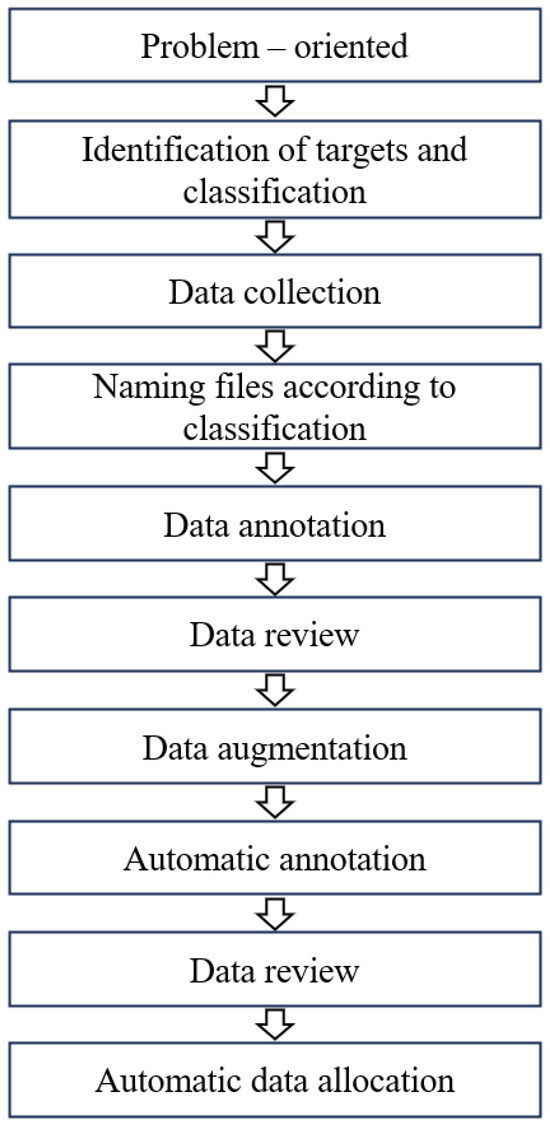 The dataset construction and annotation workflow follows these sequential steps: problem orientation, identification target classification (including classification and naming), original image collection and task assignment, image set naming and rule design, image review, data annotation, annotated data review, data augmentation, automatic annotation, augmented dataset naming and label generation, data review, automated data distribution, and final data output, as shown in Figure 2.