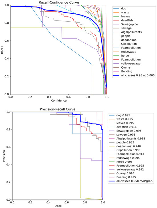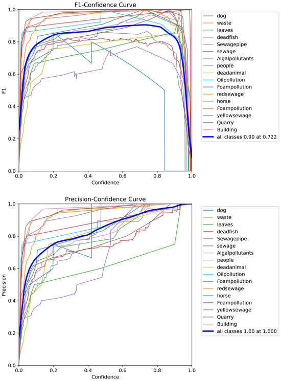 For the identification of river and lake water environment problems, a model named Water-YOLOv11n was trained using transfer learning based on the YOLOv11n architecture. As illustrated in Figure 7, the precision confidence of the water environment problem identification model reaches 1, while the average recall rate across all categories achieves 95.8% at a 0.5 threshold, indicating a high precision level. The model’s F1-score is 0.9, reflecting a favorable balance between precision and recall and demonstrating excellent overall performance. Through verification, the model shows strong capability in accurately identifying diverse water environment issues.