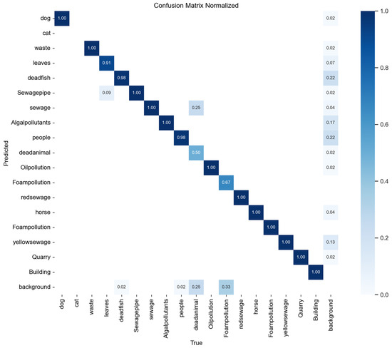 To further assess classification performance, the normalized confusion matrix is displayed in Figure 8. The matrix reveals that most categories are correctly identified with high confidence. However, some misclassification occurs between visually similar categories, such as dead animals and sewage, which reflects the inherent complexity of distinguishing closely related environmental features.