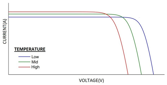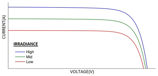 Wind speed is a positive factor in PV panel efficiency and power output, ensuring PV modules work well in energy conversion thanks to their strong cooling effects [83]. The effect of temperature change on the current–voltage (I–V) curve of the PV module and its efficiency is shown in Figure 2. The effect of radiation on the I–V curve of the PV module can be seen in Figure 3.
