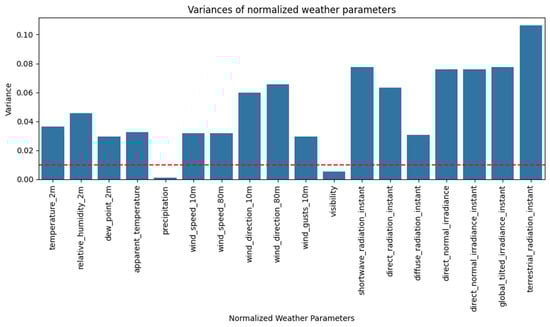 Figure 4 illustrates the variance of the normalized weather parameters. A variance threshold of 0.01, as recommended in several studies [96,97], was used to flag features with very low variability. Based on this criterion, precipitation and visibility were identified as low-variance features. Consequently, these parameters were removed from subsequent analyses to prevent them from diluting the model with near-constant values, thereby streamlining the feature set and focusing on variables that exhibit more meaningful fluctuations.