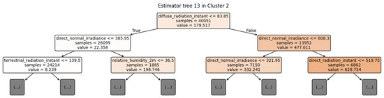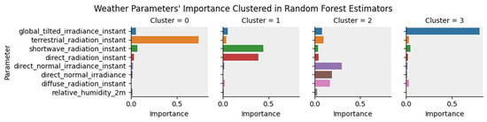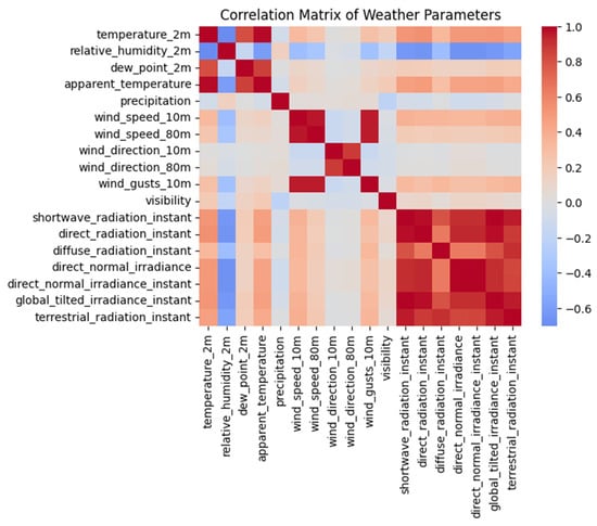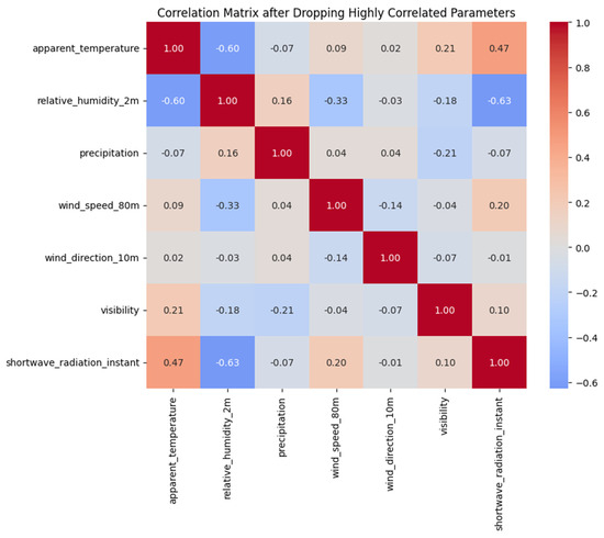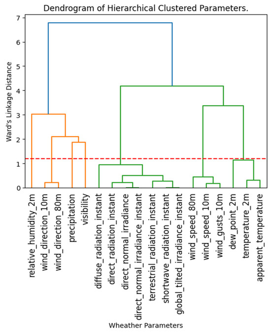 Figure 5 presents the correlation matrix of the weather parameters, clearly showing clusters of similar variables, for instance, groups related to temperature, wind, and radiation. The rationale behind this step is to pinpoint and eliminate features that largely overlap in the information they provide. Only those features contributing unique information are retained by applying Ward’s linkage distance to group parameters with strong correlation similarities. This filtering process not only streamlines the feature set but also helps minimize redundancy and reduce multicollinearity in the following stages of the analysis.
