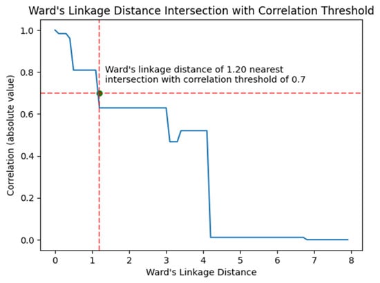 A linkage distance matrix is initially computed using Ward’s method, translating correlation values into a distance measure. A clustering algorithm then partitions this matrix based on a specified distance threshold, grouping highly similar (i.e., correlated) parameters together. Each distance threshold effectively defines how strictly the parameters must differ to remain in the reduced set; if the correlation between two parameters surpasses ±0.7, they are considered highly correlated and thus potential candidates for removal. Figure 6 depicts how the maximum absolute correlation changes with different linkage distance thresholds. By finding the intersection point where the correlation threshold of 0.7 meets the Ward linkage distance, we identify an optimal cutoff that excludes parameters displaying excessive redundancy while preserving features that capture unique information.