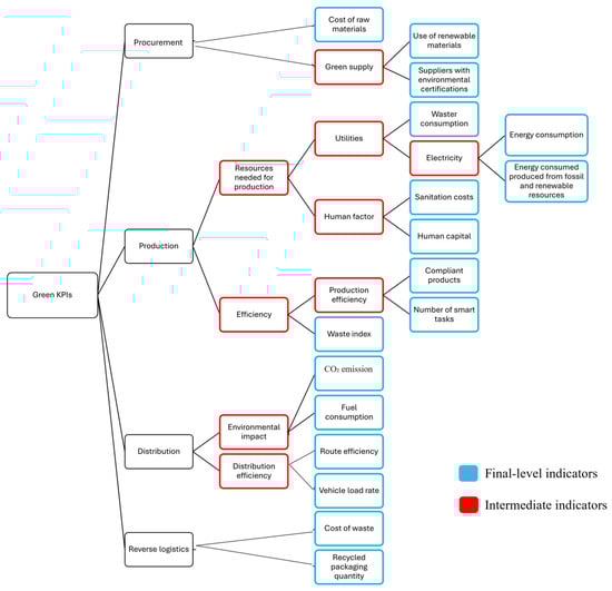 The second output of the first step is a graphical representation of the KPIs within a hierarchical structure, reflecting the relationships between individual indicators and their respective categories (procurement, production, distribution and reverse logistics) and subcategories.