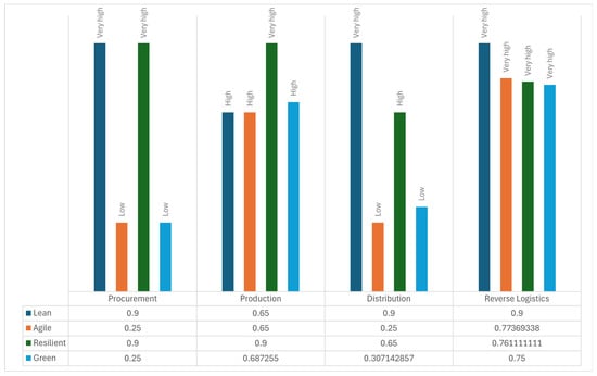 The KPIs are aggregated (see Table A13 in the Appendix D) to derive the final indicators, which include both the red values shown (subcategories) and the four main categories (Procurement, Production, Distribution, and Reverse Logistics), illustrated in Figure 2. Table 8 and Table A14, Table A15 and Table A16 in Appendix D report the inference results, providing the final truth values associated with each of these indicators, for green KPIs and other three dimensions, respectively.