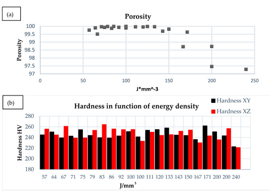 | Process | Parameters | Power | Hatch Distance | Layer Height | Energy Density | Density [%] | Hardnes | ||