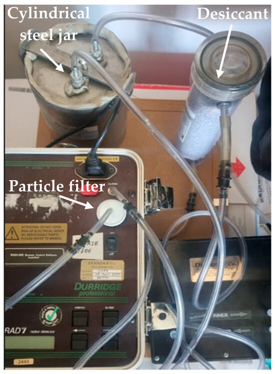 The prepared specimens were subsequently analyzed to assess the radon exhalation rate, through the closed chamber method (CCM) [31]. In detail, the experimental setup consisted of a sealed cylindrical steel chamber (2.75 L), connected in a closed-loop configuration with a Rad7 (Durridge, Billerica, MA, USA) detector. The loop included CaSO4 desiccant, vinyl tubing, a particle filter to remove moisture, and charged radon progeny (see Figure 1) [49,61,62].