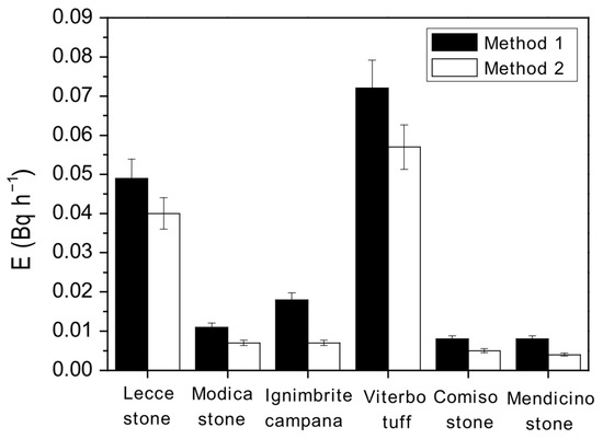 Given these results, it can be reasonably concluded that, under the tested conditions, no significant radiological hazard from indoor radon exposure is expected for human health. Finally, it is worth noting that the obtained results take into account limitations such as the small number of stone samples per type and the laboratory conditions that may differ from real-world humidity and temperature; nevertheless, poor ventilation or unusual construction, as well as wall thickness and building age, could raise exposure. To this aim, future investigations will be carried out to include in situ validation and a broader range of materials.