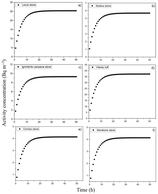 Figure 6. Radon accumulation growth curve calculated by applying the Markkanen room model in the most precautionary scenario of highest radon exhalation rate values, (i.e., as assessed by using Method 1) standard-sized room (4 m × 5 m × 2.8 m), and minimum ventilation rate (0.2 h−1) for the six investigated natural stones.