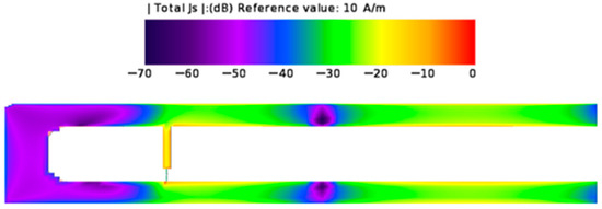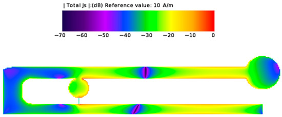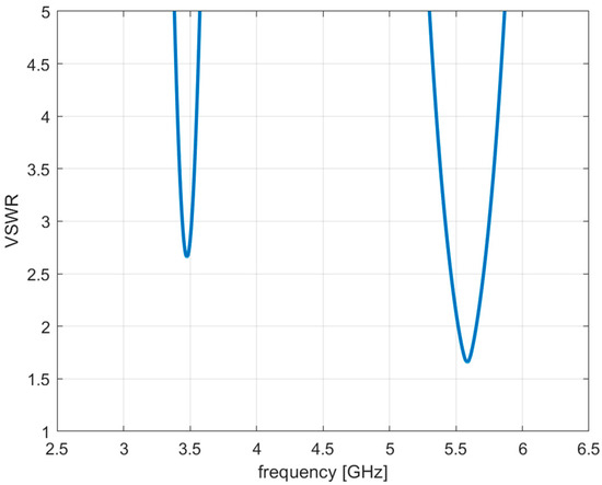 Figure 1 illustrates the dimensions of the antenna that exhibited the closest impedance matching performance to the desired specifications. It was first designed for a free space environment; however, even for this relaxed requirement, the design goal was not met. Figure 2 presents the current distribution on the antenna surface for 3.5 GHz, and Figure 3 shows this for 5.8 GHz. The simulated impedance matching results for this antenna are presented in Figure 4. The voltage standing wave ratio (VSWR) minima occurred at frequencies of 3.5 GHz and 5.6 GHz. For the first band, a significant mismatch was observed, with a VSWR of 2.7. While the impedance matching for the second band was improved (VSWR = 1.7), the frequency of optimal matching did not align with the intended specification. Therefore, a modification of the original F-type antenna structure was deemed necessary, and this revised design will be detailed in the subsequent sections of this article.