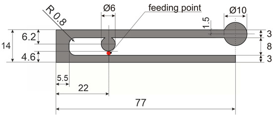 The antenna discussed in this paper is a modified inverted F antenna (IFA), with its unique geometry detailed in Figure 5. Unlike conventional IFAs, this design significantly enhances performance by incorporating circular elements at both the feed point and the radiating arm’s terminus.