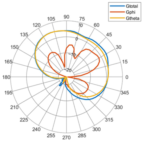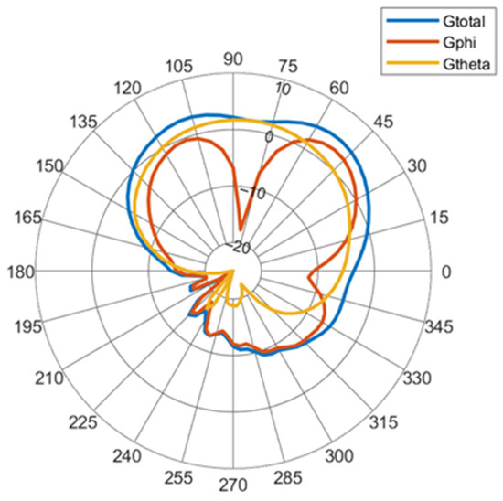 The antenna’s impedance matching characteristics, expressed as the voltage standing wave ratio (VSWR) with respect to a 50 Ω reference impedance, are depicted in Figure 9. A VSWR of ≤2 defines the impedance bandwidth, which spans 3.4 GHz to 3.6 GHz in free space and remains consistent when positioned on the human body. In the higher band, the proximity of the human head introduces a minor impedance detuning. Nevertheless, the impedance bandwidth in the free space extends from 5.61 GHz to 6 GHz, and for on-head placement, it ranges from 5.7 GHz to 6.05 GHz, effectively encompassing the target frequency bands in both scenarios. The simulated radiation patterns in the horizontal plane (x-y plane as defined in Figure 8) are presented in Figure 10 for 3.5 GHz and in Figure 11 for 5.8 GHz. For 3.5 GHz, the total gain of the antenna was Gtotal = 4.8 dBi. The component of gain for linear polarization parallel to φ versor was Gphi = 2.9 dBi. For θ, Gtheta = 1.7 dBi. For 5.8 GHz, the total gain of the antenna was Gtotal = 4.3 dBi. The component of gain for linear polarization parallel to φ versor was Gphi = −1.5 dBi. For θ, Gtheta = 4.2 dBi.