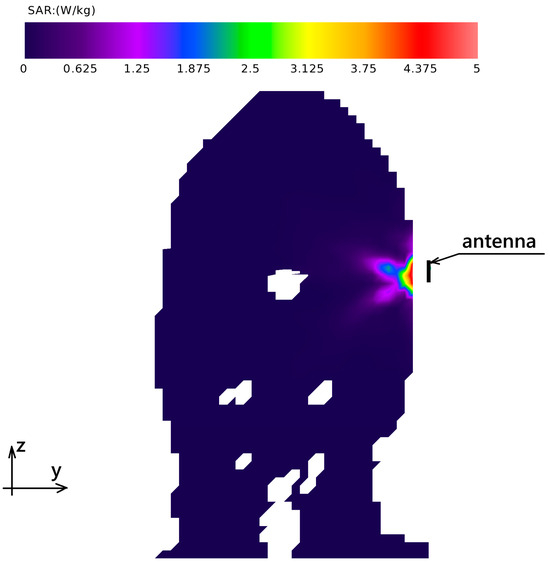 Similar results were also determined for a frequency of 5.8 GHz. Here, the maximum transmitter power was assumed not to exceed 200 mW, which is typical for the WiFi standard. For this frequency, the maximum SAR value averaged over 10 g of tissue was 0.6 W/kg, and the maximum value averaged over 1 g of tissue was 1.4 W/kg. The distribution of the SAR parameter averaged over 1 g of tissue in the z-y plane cross-section, where the highest values occur, is presented in Figure 13.