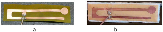 The prototype antenna was fabricated using flexible, single-sided Pyralux laminate from DuPont (Circleville, OH, USA), a material previously employed by the author for flexible wearable antenna development, demonstrating its suitability for rapid prototyping via chemical etching [23,24]. The fabricated prototype is depicted in Figure 14 and is fed via a coaxial probe. Due to the very low thickness of the substrate, the antenna is very flexible and easy to fold. To stabilize the plane shape of the antenna, it was placed on a Styrofoam spacer with a thickness of 5 mm. Due to its low density, this material has electrical properties that are very similar to air and does not introduce an impedance mismatch with the antenna.