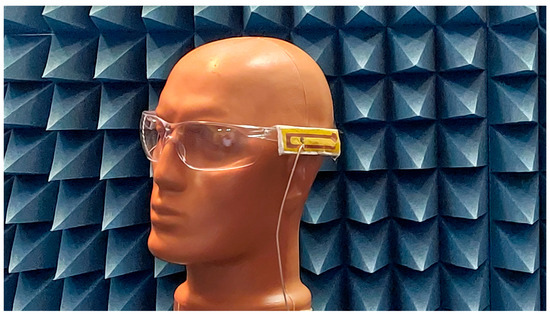 For the comprehensive characterization of the antenna, the prototype, equipped with a Styrofoam spacer, was securely attached to plastic protective glasses using adhesive tape. These glasses were then carefully positioned on a human head phantom, ensuring a consistent 9 mm separation between the antenna’s radiating element and the phantom’s surface, as visually depicted in Figure 15. The phantom itself was filled with a meticulously prepared tissue-simulating liquid, engineered to emulate the dielectric properties of human tissue at the operational frequency. This liquid exhibited a relative permittivity of 55 and a conductivity of 1.2 S/m at a frequency of 3 GHz and a temperature of 23 °C.