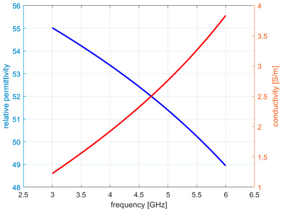 The relative permittivity (blue) and conductivity (red) of the tissue simulant vs. the frequency of the liquid, obtained from Di-Line software at a temperature of 23 °C.