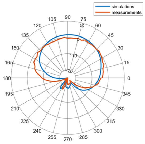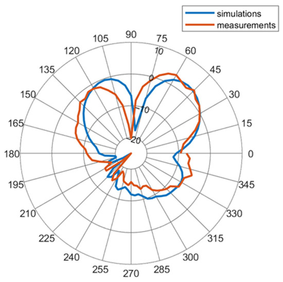 Shifting to a higher frequency of 5.8 GHz, the measured radiation pattern for vertical polarization is depicted in Figure 21. At this frequency, the maximum gain obtained for vertical polarization from the measurements was 4.7 dBi. Conversely, the radiation pattern for horizontal polarization at 5.8 GHz is also presented in Figure 22, where the maximum measured gain was recorded as −0.4 dBi.