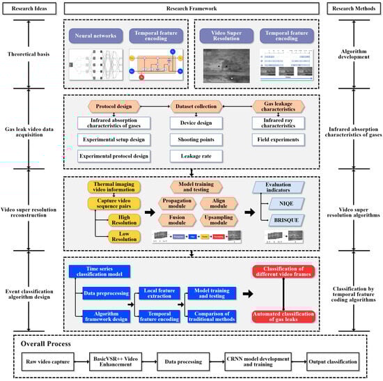 The research process of this paper is shown in Figure 2. The project mainly includes the following three stages: experimental design, dataset collection and production, and a VSR and time-series-based CRNN gas leakage detection system. Since there is no public infrared image dataset for natural gas pipeline leakage at different rates in UUTs, in order to obtain image data for model training, a complete experimental process was designed and a natural gas plant in Nanjing, China, was visited for field data collection. A set of video monitoring data of a natural gas leakage was filmed and collected. Since the clarity of the source video captured was not sufficient to support refined model training, VSR was used to achieve noise reduction and a detailed reconstruction of the video data. In addition, data enhancement is a common method that can avoid the overfitting problem in DL and improve its diversity and generalization ability. To increase the complexity of the image scene used in the experiment, data enhancement operations were performed on the image data after super-resolution reconstruction. After the dataset was completed, the CRNN algorithm based on the time series was designed and tested. It was evaluated using some indicators such as accuracy and a confusion matrix. Combined with the set gas-leakage automatic grading operation, a comprehensive UUT gas-leakage detection system was developed. In addition, the developed model was compared with the traditional CNN model to comprehensively evaluate its performance. The developed model can well meet the needs of actual detection and has application value.