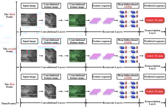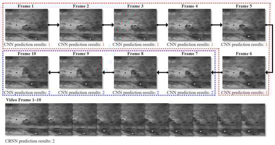 To verify the effectiveness of the model, in this section a comparative test was conducted between the CRNN model based on time series data and the traditional CNN based on single-frame images. All video data were collected based on existing cameras at the UUT site, uploaded to the data center through the local area network for BasicVSR++ and sliding window-frame extraction, and finally analyzed. The sliding window hyperparameter of the CRNN model was 10, and it was trained based on the video data; the CNN model was trained based on the image data converted from the same training datasets and tested on the same test datasets. To ensure the fairness of the comparison, each time the CNN was given 10 video frames to measure its detection effect. The traditional CNN model judged each frame of the video data separately, and finally used the voting method to take the category with the highest votes as the leakage level of the video. The accuracy of the CRNN on the test set reached 0.9852, while the performance of the CNN on the test set was only 0.96, which also proves that the developed detection method had a high detection ability. In order to intuitively compare the differences between the two models in dealing with this problem, a set of data was randomly selected for visualization and analysis. As shown in Figure 14, this set of video had a total of 10 frames, and the leakage level was 2.