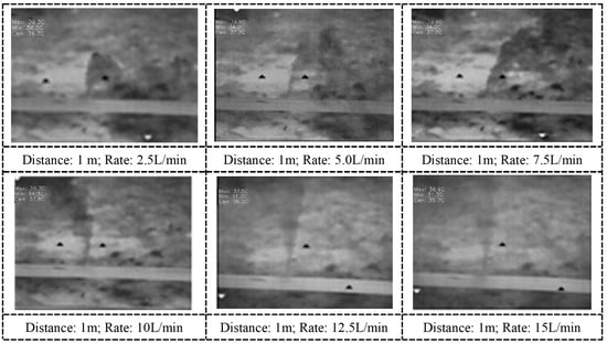 To obtain more realistic experimental data, the data collection of this experiment is carried out in a natural gas plant in Nanjing, China. The experimental device is set up according to the schematic diagram of the experimental device shown in Figure 5. First, holes were drilled on the seamless steel pipe using professional drilling equipment to simulate the gas leakage points in real situations. Then, the liquefied gas tank and the seamless steel pipe were connected with a hose. The connection needed to be sealed and fixed. A gas leakage infrared detector was set up at the pre-designed point, and the tripod height and detector angle were adjusted. The liquefied gas switch was turned on, and the gas flow rate was controlled by the brass pressure-reducing valve. Figure 6 shows the state of the leaking gas at different leakage rates taken at a distance of 1 m, focusing on the shape of the gas column.
