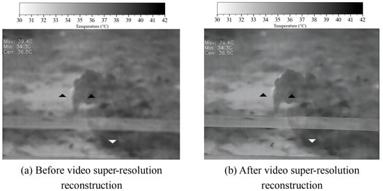 The real-world VSR reconstruction results of the UUT gas leakage event based on the BasicVSR++ model is shown in Figure 7. The reconstructed gas-leakage feather image is clearer, the edge details in the low-resolution image are restored, the noise is effectively reduced, and the information quality of the image is improved. In addition, NIQE and BRISQUE were used to further quantify the evaluation algorithm results. Due to the limited computing resources, only the first frame, middle frame, and last frame of each video sequence were extracted for indicator evaluation. The NIQE of the original image was 7.4006, and the NIQE after the output of the BasicVSR++ was 3.0021, which is a decrease of 4.3985 points. Similarly, the BRISQUE of the original image was 22.3987, and the BRISQUE after the output of the BasicVSR++ was 18.2362, which is a decrease of 4.1625 points. The above results prove that the VSR reconstruction based on the BasicVSR++ is successful, which provides a basis for subsequent video grading and recognition.