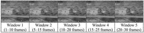 In this experiment, the window size is set as a hyperparameter of the model expression, with a value range of 5 frames, 10 frames, 25 frames, and 50 frames. The step size is 5 frames, and the schematic diagram of the data after segmentation is shown in Figure 9. The initial window is set to 5 frames (about 0.2 s, the video has a frame rate of 30 fps) to capture the minimum effective time unit of the transient response during the leakage process. The step size is set to 5 frames to reduce redundant calculations while retaining time continuity, thereby achieving the optimal trade-off between efficiency and accuracy. When switching the leakage flow rate, it is necessary to remove the first and last 15 s of each video in order to improve the imaging accuracy of the picture.