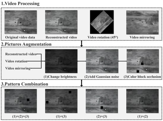Six videos are shot for the six experimental levels set, and each video contained 3750 video frames after processing. To improve the training effect, enhance the robustness of the model, and achieve the purpose of expanding the dataset, data enhancement operations are required. Unlike traditional image detection, video detection needs to consider the relationship between different video frames, so different data enhancement methods need to be carried out in stages. After all videos are super-resolution reconstructed, each video is rotated 45 degrees as a prerequisite for later video enhancement. Similarly, the video after super-resolution reconstruction is mirrored, which includes horizontal mirroring and vertical mirroring. The super-resolution reconstructed video, the rotated video, and the mirrored video are used as three types of data sources for frame extraction, and the extracted video frames are subjected to another data enhancement operations, such as changing brightness, adding Gaussian noise, and adding color block occlusion. Unlike the low-definition noise that comes with the original data, Gaussian noise is a noise pixel point that conforms to the Gaussian distribution and does not interfere with the high-precision reproduction of the edge and contour of the target by super-resolution reconstruction. It is worth noting that only the square black blocks are added to the image for image occlusion. The black triangles and white triangles in the figure are the system graphics when the monitoring instrument is calibrated. Therefore, the triangular blocks exist in the original image data, but they are not objects added by data enhancement. Figure 10 shows the effect of data enhancement.