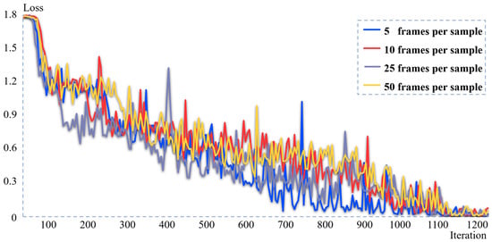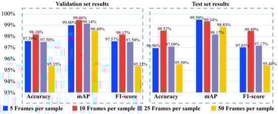 This experiment trained the CRNN model on the four video frame numbers of 5, 10, 25, and 50 frames, as well as evaluated the effect on the test set training loss curves, as shown in Figure 11. In the initial training, the loss of the model in the four experiments showed a rapid downward trend. After about 900 iterations, the model gradually began to converge and showed a stable trajectory. Figure 12 shows the performance evaluation results, where the model performed best when the number of video frames for a single sample was 10. On the validation set, its accuracy, mAP, and F1 score were 98.18%, 99.46%, and 0.9817, respectively; on the test set, the comprehensive effect of the dataset with 10 frames per sample was also excellent, with an accuracy, mAP, and F1 score of 98.52%, 99.34%, and 0.9849.