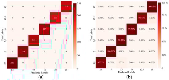 In the supervised learning field of machine learning, classification results and actual measurement results are often compared through confusion matrices. The confusion matrix is a visualization tool that can present the accuracy of the classification results and depict the true positives, true negatives, false positives, and false negatives of each category. Figure 13 shows the confusion matrix of the dataset of 10 frames per sample on the test set. The test set is automatically extracted from the dataset according to the algorithm. There are more than 200 corresponding test samples for each leakage level. Figure 13a shows the difference between the predicted results and the actual labels of the various leakage levels. In Figure 13b, the values are in percentile, and it is determined that the CRNN has a correct rate of more than 90% for each leakage level. The best performance is achieved for leakage levels of 5.0 L/min and 15 L/min, achieving 100% correct recognition. The results prove that the developed method has strong detection capabilities. It can meet the needs of industrial detection.