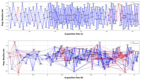 Figure 2 presents the perpendicular baselines of the interferograms derived from both ascending (a) and descending (b) orbits. The interferograms generated for multi-temporal InSAR analysis were evaluated based on both temporal and geometric criteria. Interferograms with coherence values below 0.05 are highlighted in red, and were excluded from the analysis. This filtering was carried out to enhance the reliability of the results.