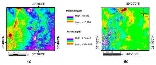 The cumulative LOS (line-of-sight) velocity maps derived from the ascending and descending orbits revealed distinct deformation patterns across the study area. The descending orbit results highlighted more localized zones of displacement, while the ascending data captured broader and more intense deformation trends. Deformation velocities ranged approximately between −1.1 cm/year and +1.0 cm/year for the descending data, and −3.8 cm/year and +3.8 cm/year for the ascending data. These maps visualized long-term ground motion at the pixel level, enabling the identification of uplift and subsidence areas.