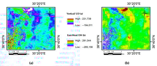 Decomposition of the cumulative LOS velocity maps: (a) vertical (up–down) deformation component, and (b) east–west horizontal deformation component derived from the combination of ascending and descending orbit data.