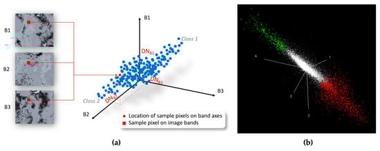 (a) Schematic illustration of how pixel values across multiple bands define their position in the three-dimensional feature space. (b) The scatter plot of the n-D Visualizer displays red and green pixel clouds, which represent disparate deformation zones. Four InSAR products are represented on four axes.